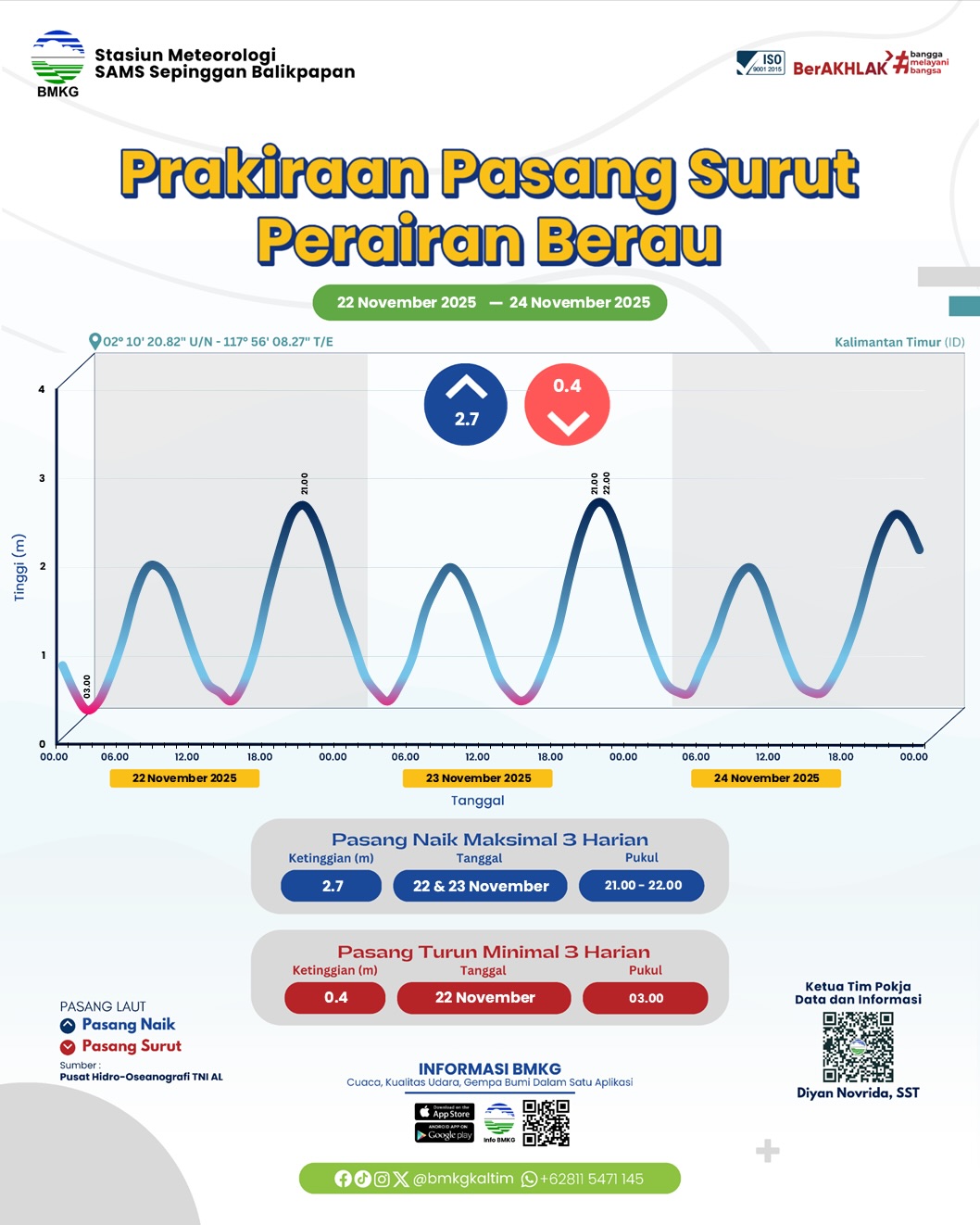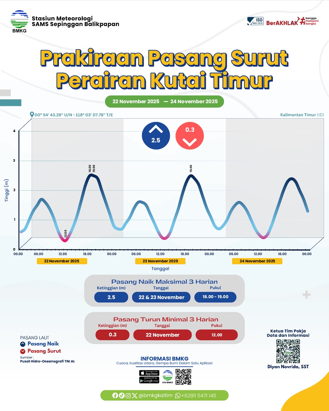 kewaspadaan. Berdasarkan prakiraan pasang surut tanggal 22–24 November 2025,