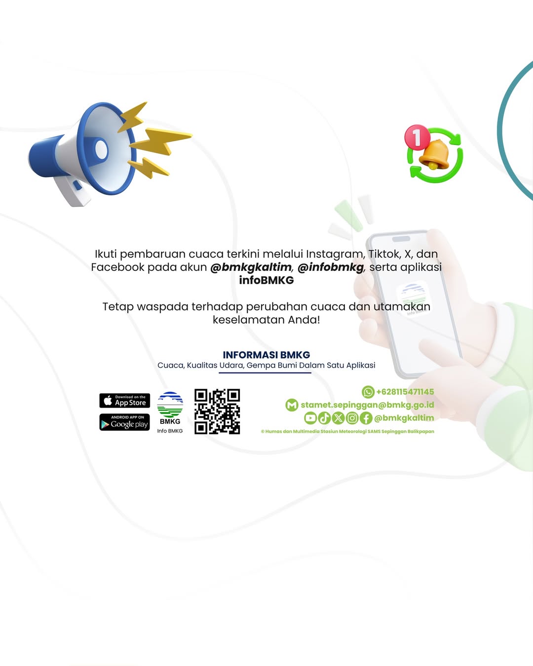 Untuk pemantauan informasi cuaca, maritim, dan peringatan dini secara lebih cepat dan akurat, silakan unduh aplikasi InfoBMKG melalui App Store maupun Google Play Store.