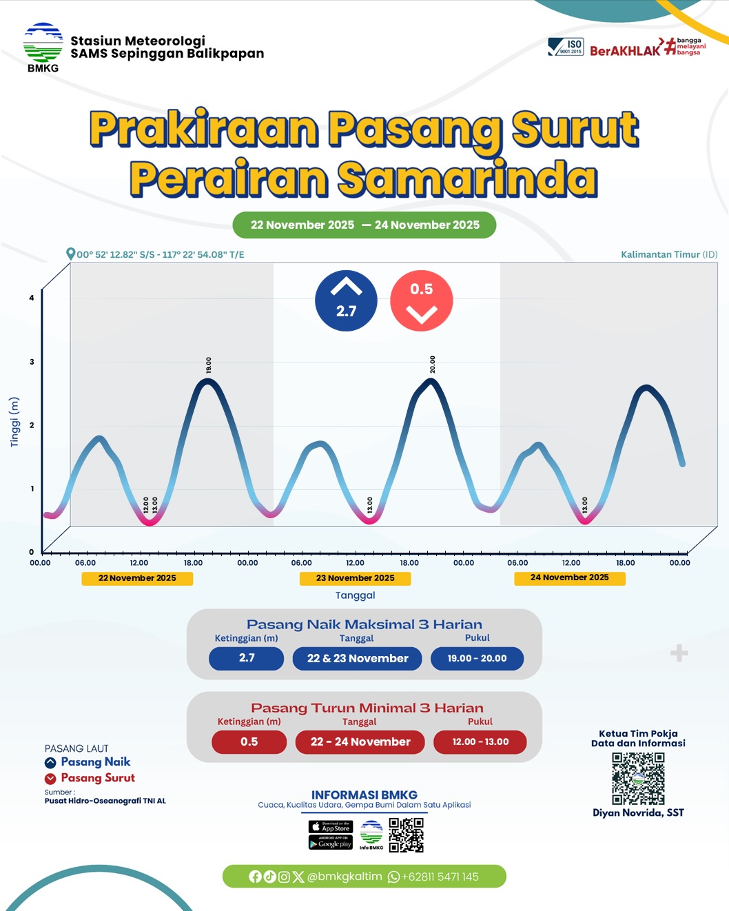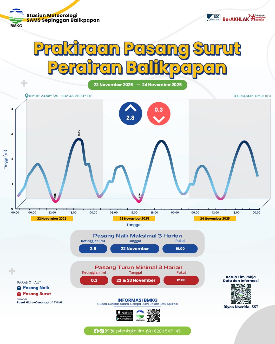 kewaspadaan. Berdasarkan prakiraan pasang surut tanggal 22–24 November 2025,